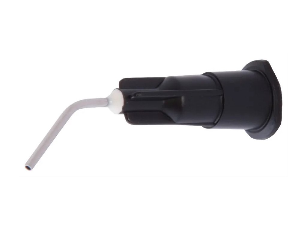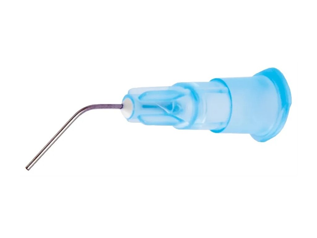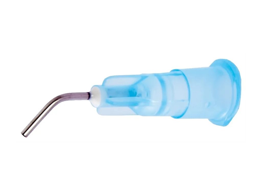 tuhnoucího materiálu. Ohnutá kovová jehla (30.° nebo 45.°) umožňuje optimální přístup do dutiny.