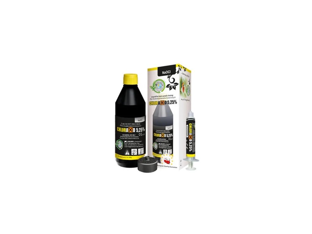 NaOCl 5,25% baktericidni roztok k výplachu kořenových kanálků, doporučuje se použivat s kofferdamem.