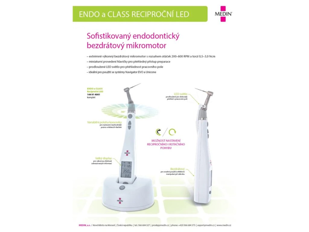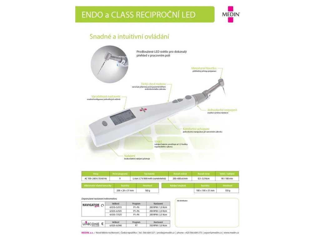 Sofistikovaný endodontický bezdrátový mikromotor s možností nastavení recipročního i rotačního pohybu. Extrémně výkonný bezdrátový mikromotor s rozsahem otáček 200–600 RPM a torzí 0,5–3,0 Ncm. Miniaturní provedení hlavičky pro přehledný přístup preparace. Prodloužené LED světlo pro přehlednost pracovního pole. Ideální pro použití se systémy Navigator EVO a Unicone. Rozměry 208 × 29 × 31 mm, hmotnost 160 g.