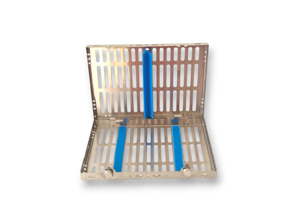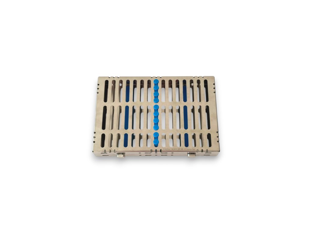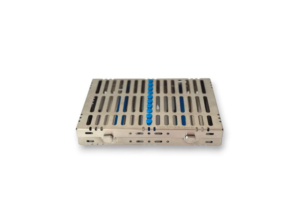 Kaseta na nástroje - malá je vyrobená z odolné nerezové oceli s uzávěrem a silikonovými vložkami. Navržen pro zajištění a skladování zubních a chirurgických nástrojů pro sterilizaci.