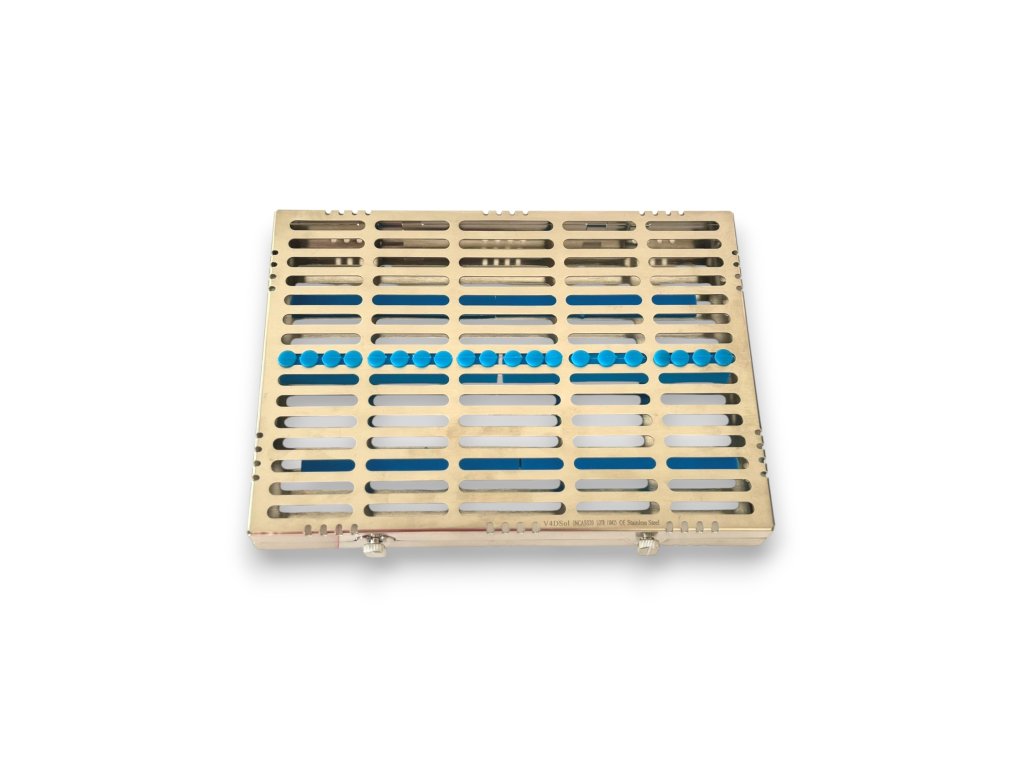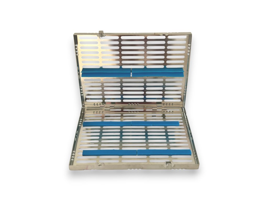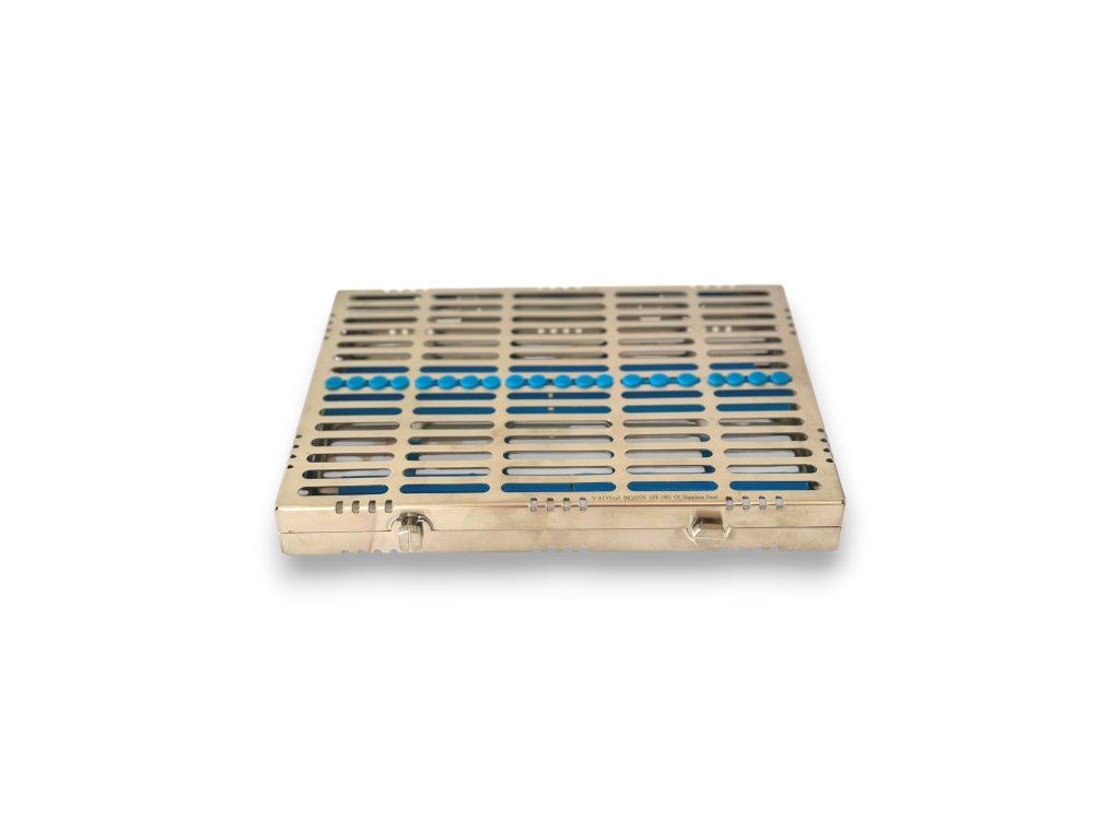 Velká kazeta na nástroje je vyrobená z extra odolné nerezové oceli s uzávěrem a silikonovými vložkami. Navrženo pro zajištění a uložení nástrojů pro sterilizaci. Pojme 20 ks chirurgických nástrojů.